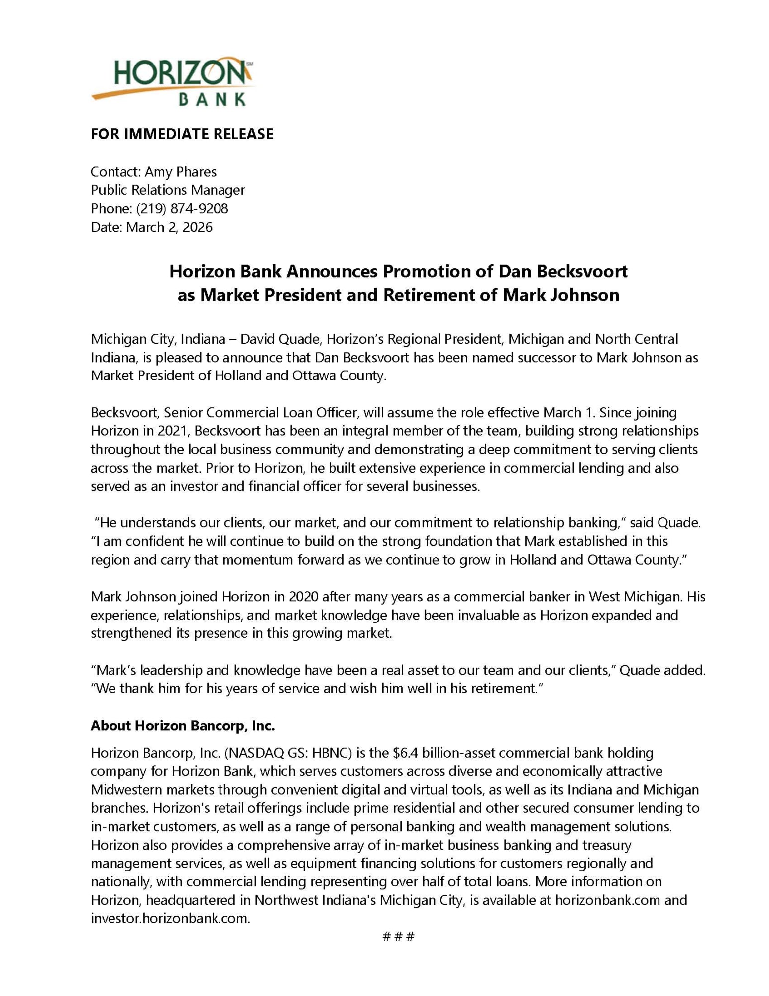 Horizon Bank Announces Promotion of Dan Becksvoort as Market President and Retirement of Mark Johnson